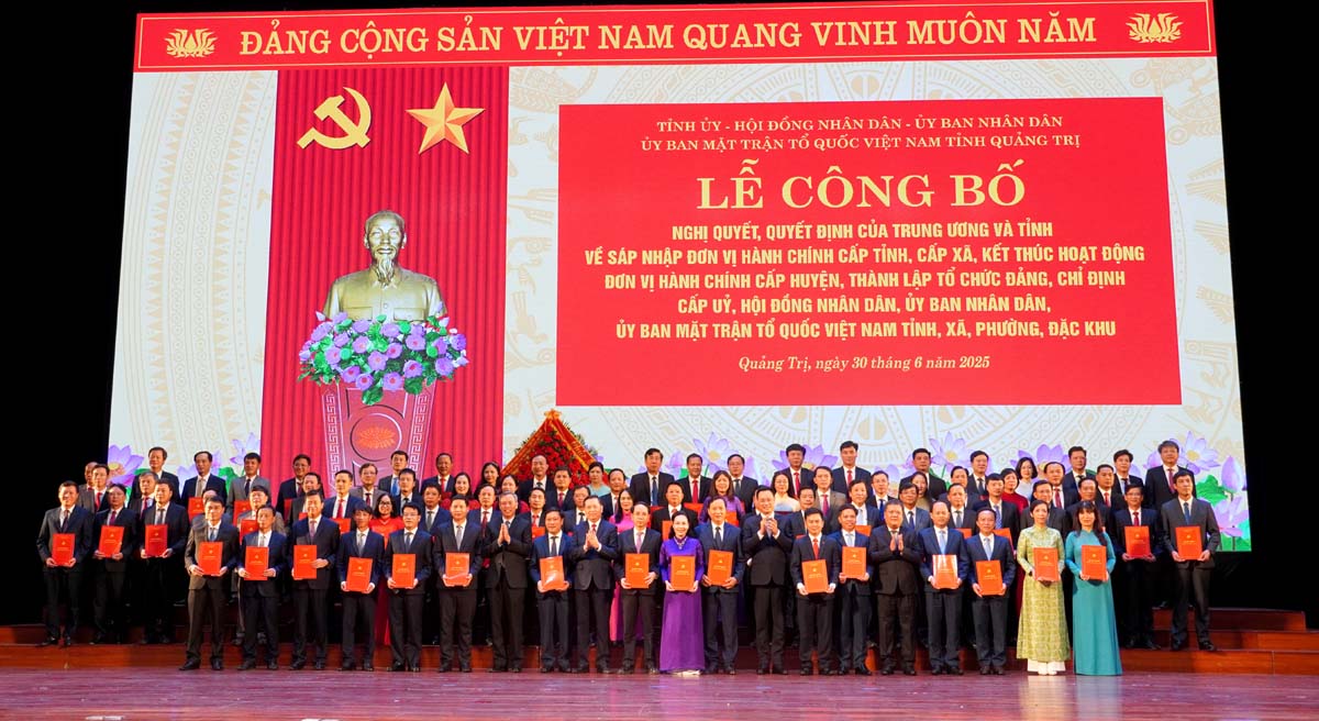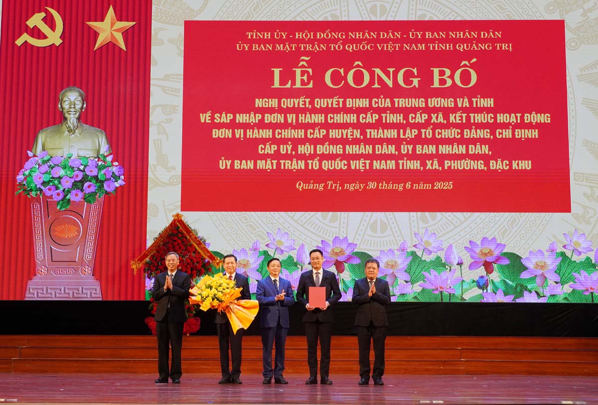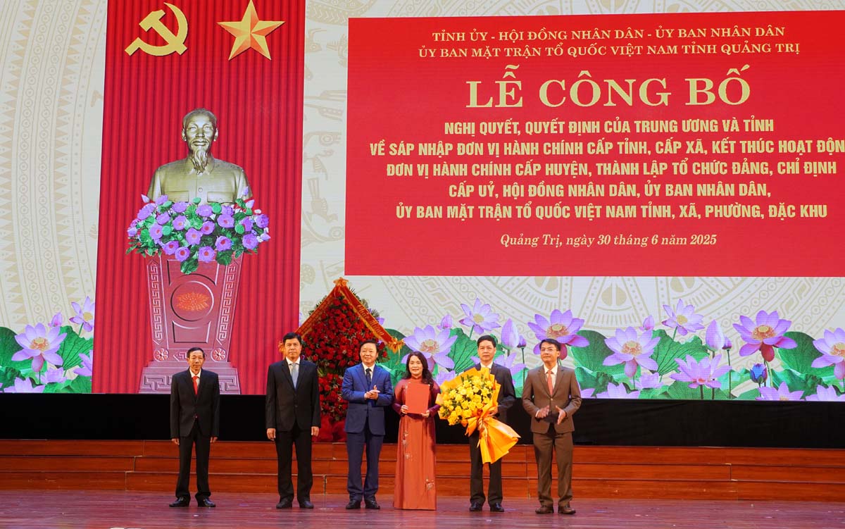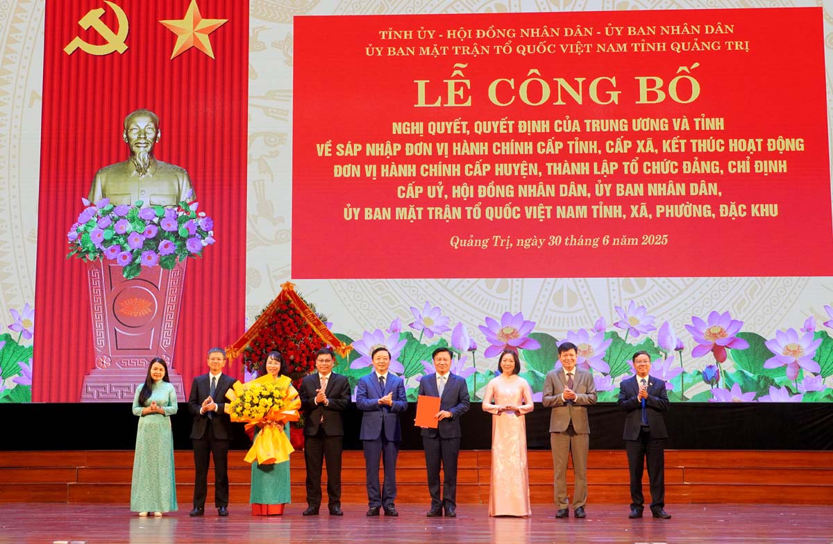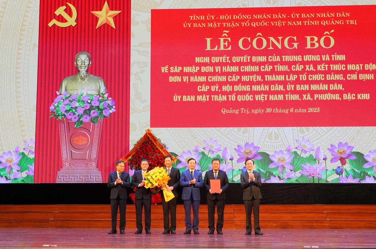 (Quang Binh Portal) - Sáng ngày 30/6/2025, tại Trung tâm Văn hóa - Điện ảnh tỉnh Quảng Bình, Tỉnh ủy, HĐND, UBND, Ủy ban MTTQVN hai tỉnh Quảng Bình, Quảng Trị long trọng tổ chức lễ công bố các Nghị quyết, Quyết định của Trung ương và tỉnh về sáp nhập đơn vị hành chính cấp tỉnh, cấp xã, kết thúc hoạt động đơn vị hành chính cấp huyện, thành lập tổ chức Đảng, chỉ định cấp ủy, HĐND, UBND, Ủy ban MTTQ Việt Nam tỉnh và xã, phường, đặc khu thuộc tỉnh Quảng Trị (mới). Phó Thủ tướng Chính phủ Trần Hồng Hà dự và chỉ đạo lễ công bố.