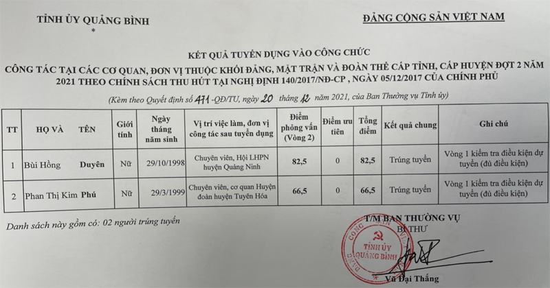 Kết quả tuyển dụng vào công chức công tác tại các cơ quan, đơn vị thuộc khối Đảng, mặt trận và Đoàn thể cấp tỉnh, cấp huyện đợt 2 năm 2021