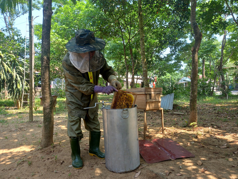 Ông Thú thu mật ong trong vườn nhà.