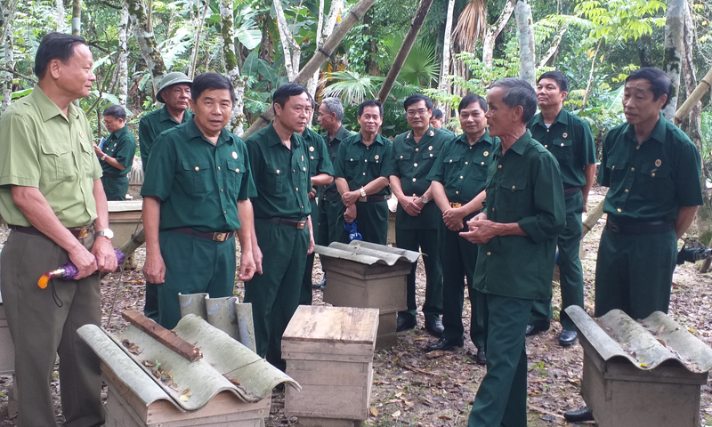 Lãnh đạo Hội CCB tỉnh tham quan mô hình nuôi ong của CCB Đinh Xuân Khách, xã Xuân Hóa (Minh Hóa).