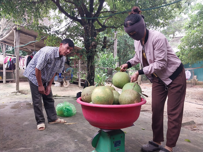 Người dân xã Hóa Hợp xuất bán bưởi da xanh và bưởi Phúc Trạch ra thị trường.