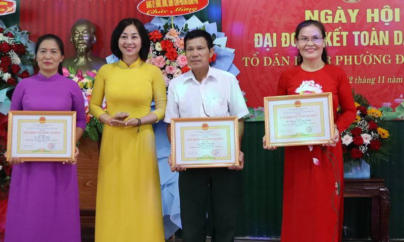 Đồng chí Chủ tịch Ủy ban MTTQVN tỉnh Phạm Thị Hân tặng hoa và quà chúc mừng KDC Hà Thiệp nhân dịp “Ngày hội Đại đoàn kết toàn dân tộc” năm 2022.