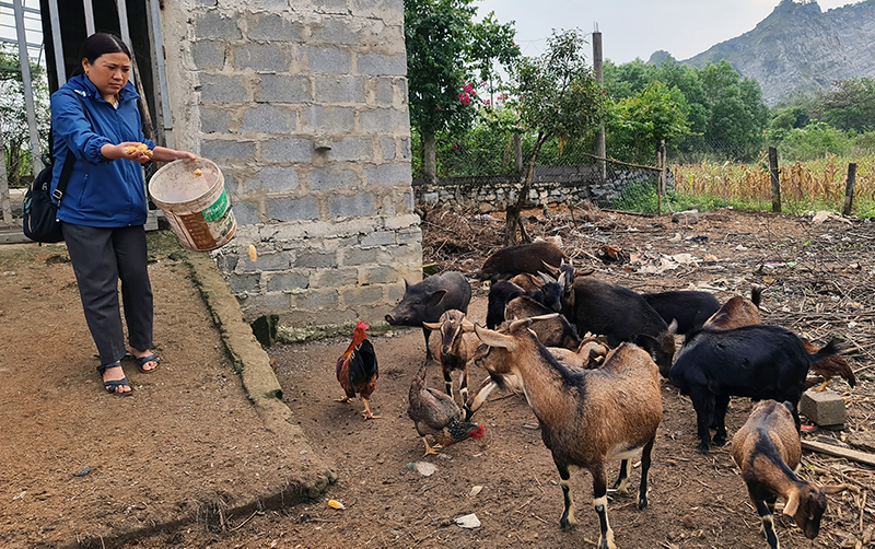 Lúc chúng tôi đến, chị Trần Thị Chung đang cho đàn dê ăn. Nếu không tìm hiểu hoàn cảnh của chị từ trước thì chắc sẽ không nhận ra đây là người phụ nữ bị mù bẩm sinh từ nhỏ. Bởi, trông chị rất nhanh nhẹn và thạo việc, một tay chị chăm lo đàn vật nuôi của gia đình.
