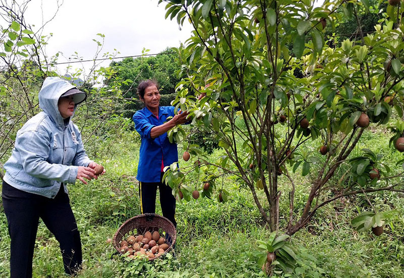 Hôm chúng tôi đến thăm mô hình trồng cây ăn quả trên diện tích gần 3ha, bà Vây đang dọn cỏ cho những gốc hồng xiêm trĩu quả sắp thu hoạch. Không giấu được sự phấn khởi và tự hào, bà Vây chỉ cho chúng tôi xem vườn cây ăn quả xanh mát chạy dọc trên triền đồi. Bà chia sẻ, nghĩ lại những tháng ngày cơ cực, phát nương làm rẫy, tôi chưa bao giờ nghĩ gia đình mình sẽ có được ngày hôm nay. Những hàng cây ăn quả đủ loại, từ mít, hồng xiêm, cam, bưởi, ổi… gần như cho thu hoạch quanh năm, cũng đồng nghĩa với thu nhập đều đặn, ổn định.