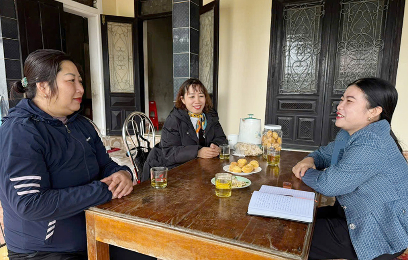 Chị Trà Thị Minh Hải (người ngồi giữa) đang trò chuyện với đồng nghiệp về mái ấm của mình.