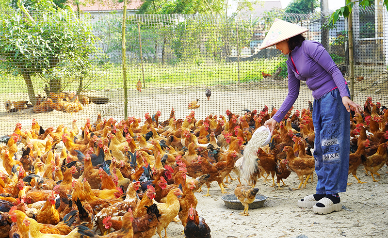 Mô hình nuôi gà thả vườn mang lại thu nhập ổn định cho gia đình chị Phan Thị Lương.