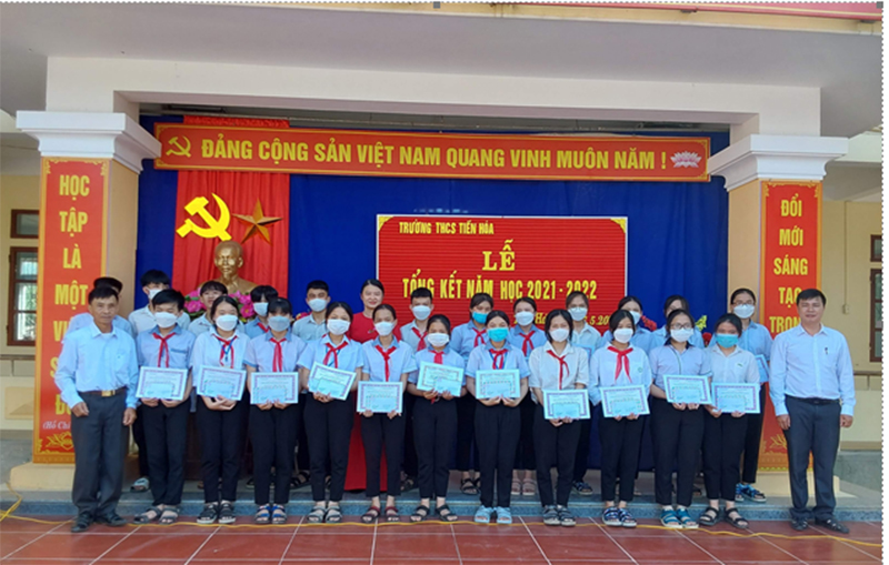 Ban Giám hiệu Trường THCS Tiến Hóa trao thưởng cho các học sinh có thành tích học tập xuất sắc năm học 2021 - 2022