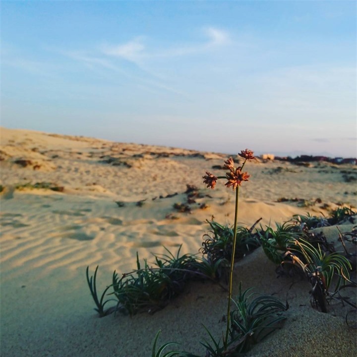 Điểm xuyết trên những dải cát mịn màng là thấp thoáng các bụi cây, những nhánh hoa dại mọc lên mạnh mẽ giữa bãi cát hoang sơ, khô cằn.