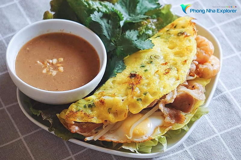Để có những chiếc bánh khoái thơm ngon, người Quảng Bình phải chế biến tỉ mỉ, khéo léo từ khâu trộn bột, rán bánh cho đến bước chọn gia vị, pha nước chấm,… (Ảnh: Phong Nha Explorer)
