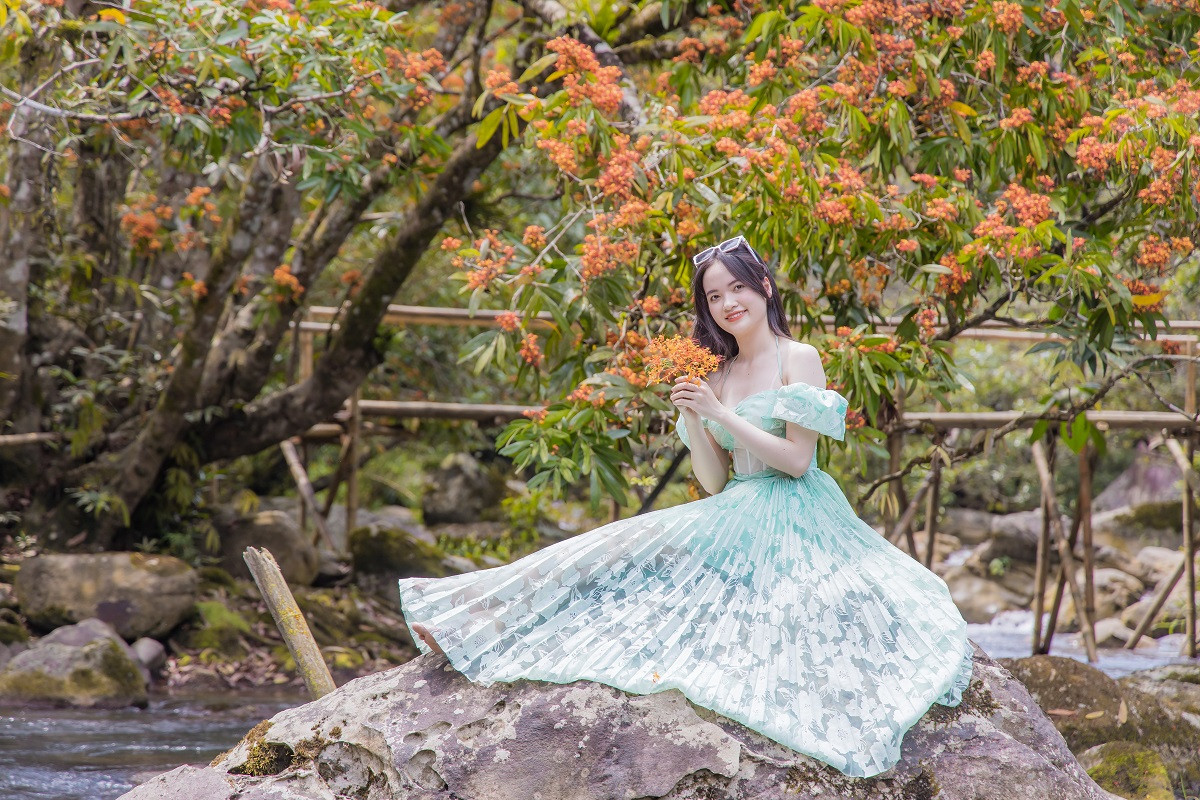 Thiếu nữ diện váy áo xinh tươi đến suối Moọc để chụp ảnh. Ảnh: TTDL