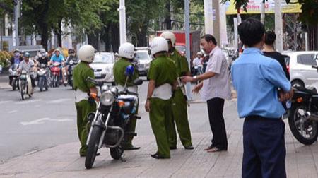 Một tài xế tranh cãi với nhóm cảnh sát trật tự, cảnh sát cơ động khi bị xử phạt về việc đậu xe trả khách trước khách sạn trên đường Nguyễn Thị Minh Khai, Q.3 (TP.HCM) chiều 26-6. Từ ngày 1-7, người bị xử phạt vi phạm hành chính có quyền chứng minh mình không vi phạm - Ảnh: T.T.D. |