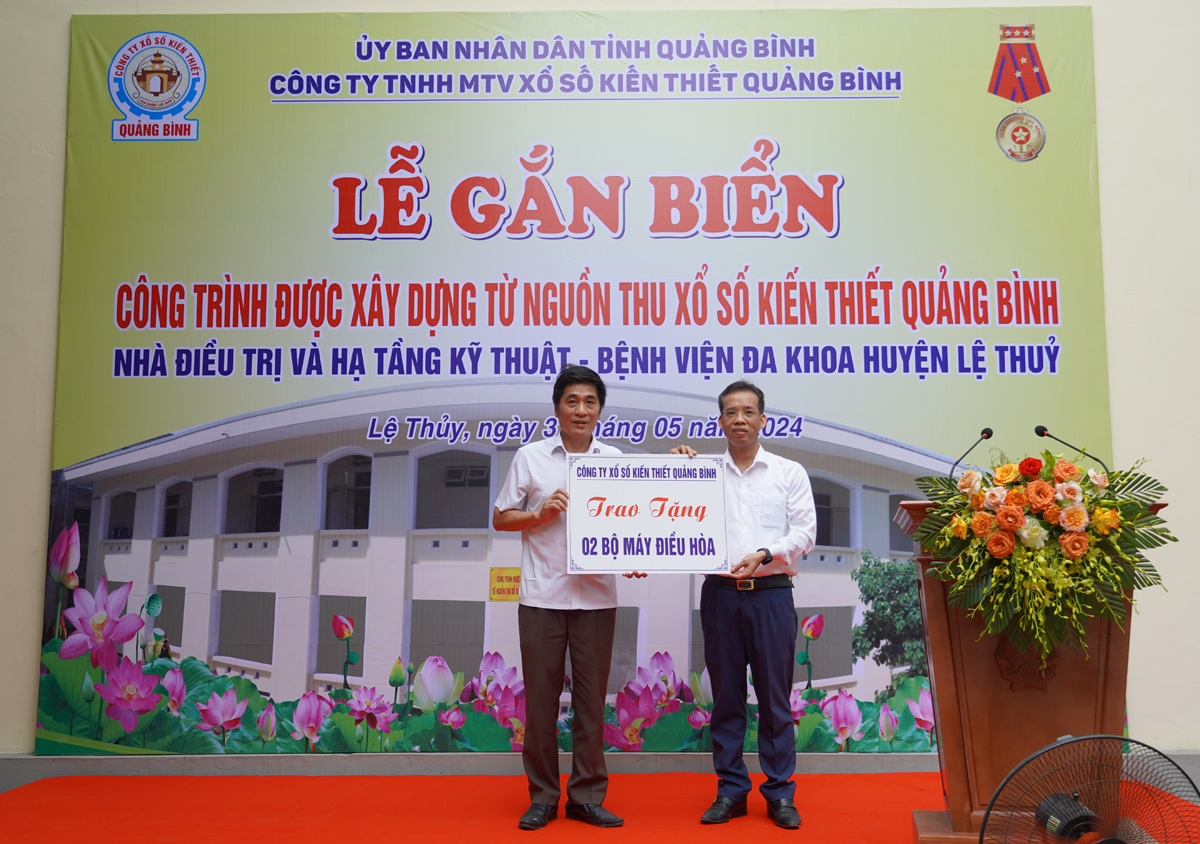 Tại buổi lễ gắn biển công trình, lãnh đạo Công ty TNHH MTV XSKT Quảng Bình cũng đã trao tặng 02 bộ máy điều hòa cho Bệnh viện Đa khoa huyện Lệ Thủy.