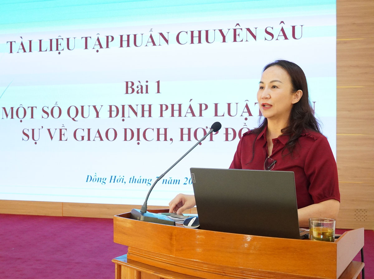 Tại hội nghị, đồng chí Lê Thị Hoàng Thanh, Phó Vụ trưởng Vụ Pháp luật dân sự - kinh tế, Bộ Tư pháp đã phổ biến các quy định của pháp luật dân sự về hợp đồng, giao dịch; điểm mới của Luật Nhà ở năm 2023, Luật Kinh doanh bất động sản năm 2023 và một số vấn đề về hợp đồng liên quan đến bất động sản...; đồng thời trao đổi, giải đáp, hướng dẫn xử lý những vấn đề mà các đại biểu quan tâm.
