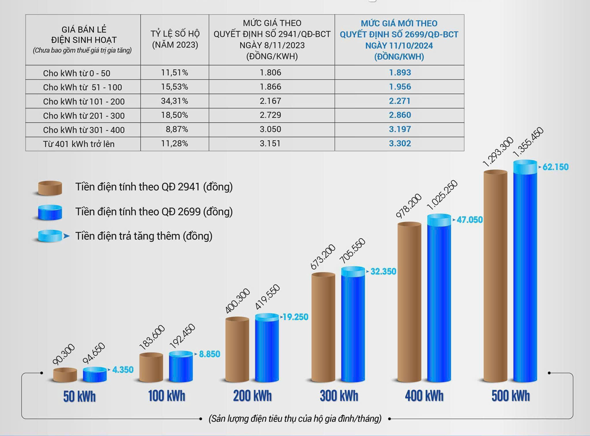 Mức giá bán lẻ tiền điện bình quân mỗi tháng sau điều chỉnh tăng giá điện từ ngày 11/10/2024
