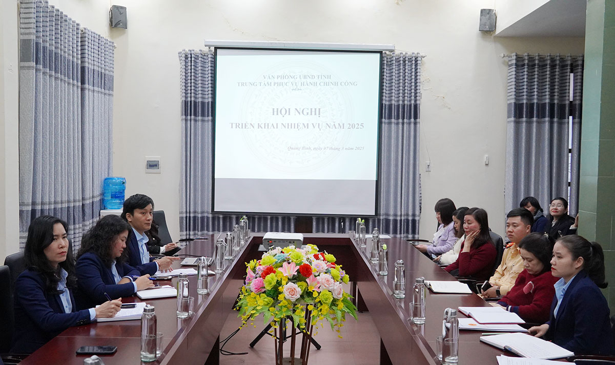 (Quang Binh Portal) - Chiều ngày 07/03/2025, Trung tâm Phục vụ hành chính công tỉnh tổ chức hội nghị tổng kết năm 2024 và triển khai nhiệm vụ năm 2025. Đồng chí Trần Văn Hoài, Phó Chánh Văn phòng UBND tỉnh, Giám đốc Trung tâm Phục vụ hành chính công tỉnh chủ trì hội nghị.