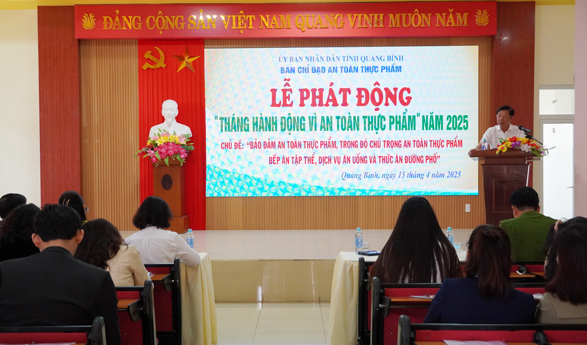 (Quang Binh Portal) - Sáng ngày 15/4/2025, Ban Chỉ đạo An toàn thực phẩm (ATTP) tỉnh tổ chức lễ phát động “Tháng hành động vì ATTP” năm 2025 với chủ đề “Bảo đảm ATTP, trong đó chú trọng ATTP bếp ăn tập thể, dịch vụ ăn uống và thức ăn đường phố”. Tham dự lễ phát động có đại diện lãnh đạo các sở, ban, ngành, đơn vị cấp tỉnh; Ban Chỉ đạo ATTP các huyện, thị xã, thành phố; các cơ sở sản xuất, kinh doanh thực phẩm trên địa bàn tỉnh.