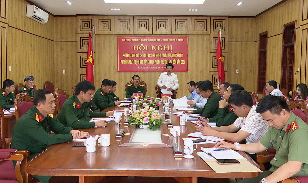 (Quang Binh Portal) - Sáng ngày 03/4/2024, Ban Thường vụ Đảng ủy Quân sự tỉnh và Thường trực Thị ủy Ba Đồn tổ chức hội nghị phối hợp lãnh đạo, chỉ đạo thực hiện nhiệm vụ quân sự, quốc phòng và thống nhất ý định diễn tập khu vực phòng thủ thị xã năm 2024. Đồng chí Trương An Ninh, Ủy viên Thường vụ Tỉnh ủy, Bí thư Thị ủy Ba Đồn; Đại tá Đinh Xuân Hướng, Phó Bí thư Đảng ủy, Chính ủy Bộ Chỉ huy Quân sự tỉnh chủ trì hội nghị.
