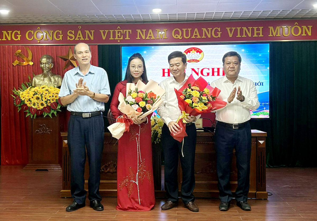 Đại diện lãnh đạo Thành ủy Đồng Hới và Ủy ban MTTQVN tỉnh tặng hoa cho các đồng chí Nguyễn Hữu Phước và Nguyễn Thị Mỹ Lợi