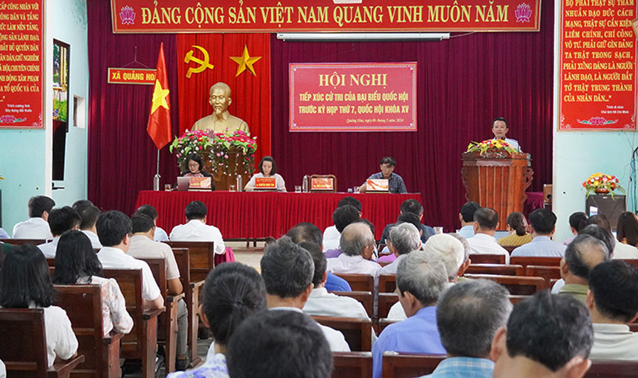 (Quang Binh Portal) -  Sáng ngày 06/5/2024, Đoàn Đại biểu Quốc hội (ĐBQH) tỉnh gồm các đại biểu: Nguyễn Minh Tâm, Tỉnh ủy viên, Phó trưởng đoàn chuyên trách Đoàn ĐBQH tỉnh; Nguyễn Thị Tuyết Nga, Ủy viên chuyên trách Ủy ban Văn hóa - Giáo dục của Quốc hội; Trần Quang Minh, Phó Chủ tịch Ủy ban MTTQVN tỉnh tiếp xúc cử tri tại xã Quảng Hòa, thị xã Ba Đồn trước kỳ họp thứ 7, Quốc hội khóa XV. Tham dự có đồng chí Trương An Ninh, Ủy viên Ban Thường vụ Tỉnh ủy, Bí thư Thị ủy Ba Đồn; đại diện lãnh đạo các sở, ban, ngành cùng đông đảo cử tri.