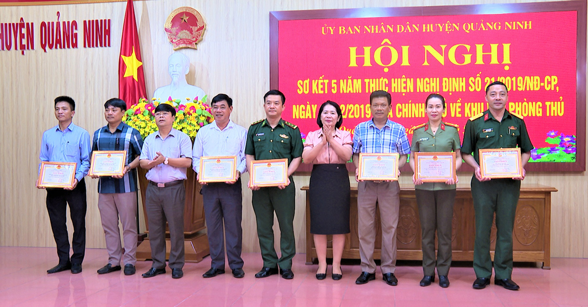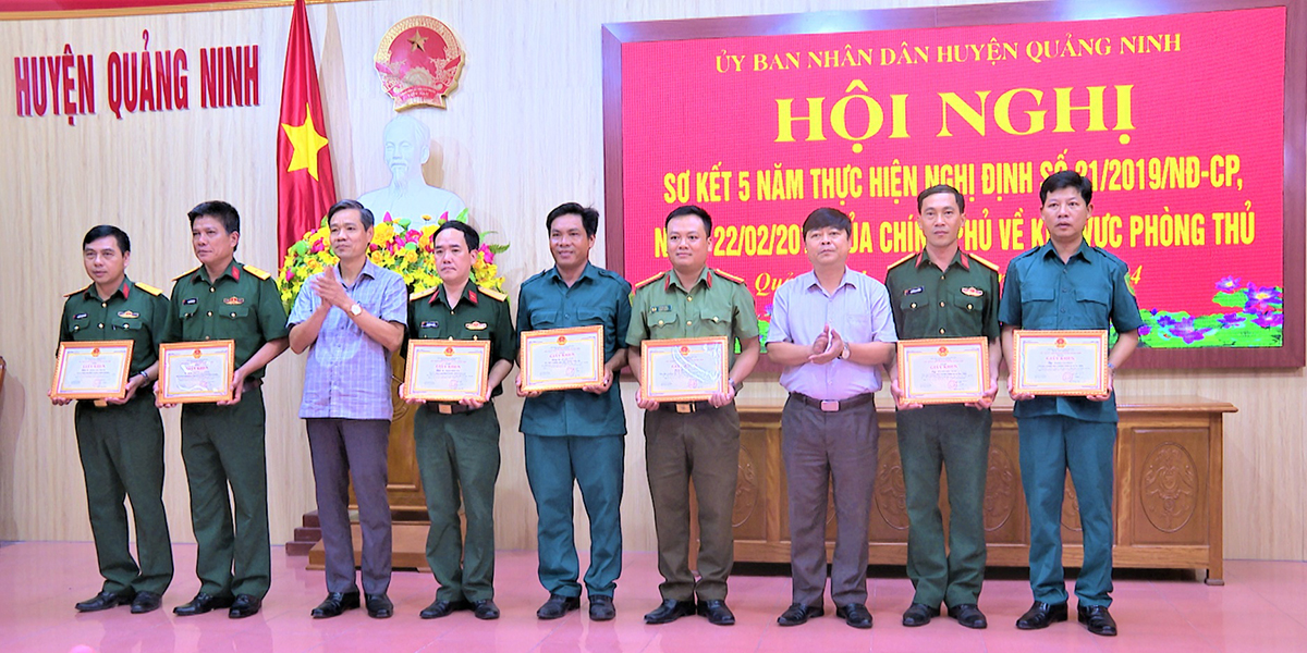 Dịp này, UBND huyện Quảng Ninh đã khen thưởng một số tập thể và cá nhân có thành tích xuất sắc trong 05 năm thực hiện Nghị định số 21/2019/NĐ-CP ngày 22/02/2019 của Chính phủ về khu vực phòng thủ.