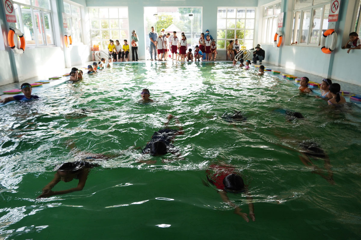 Sau lễ phát động, Ban Tổ chức đã khởi động tiết học bơi đầu tiên cho các em học sinh từ lớp 2 - 5 và thực hành các động tác sơ cứu đuối nước tại bể bơi.