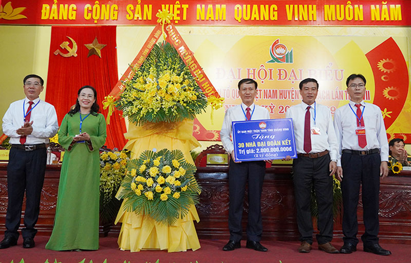 Chủ tịch Ủy ban MTTQVN tỉnh Phạm Thị Hân tặng hoa chúc mừng Đại hội và trao Biển tượng trưng hỗ trợ xây dựng nhà ĐĐK cho huyện Bố Trạch