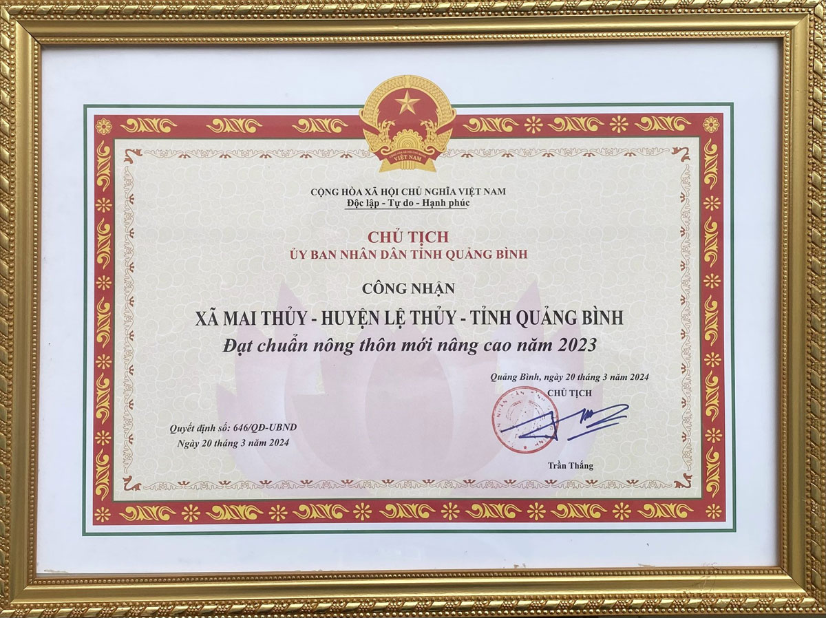 Chủ tịch UBND xã Phan Thanh Hà cho biết thêm: “Trong lộ trình dây dựng nông thôn mới nâng cao, đời sống vật chất và tinh thần của người dân xã Mai Thủy chúng tôi đã được nâng lên rõ rệt, ngành nghề nông thôn phát triển mạnh, góp phần giải quyết việc làm, tăng thu nhập, tỷ lệ hộ nghèo giảm. Cơ sở hạ tầng được quan tâm đầu tư, cơ bản đáp ứng cho sự phát triển kinh tế - xã hội. Cảnh quan môi trường, bộ mặt quê hương từng bước đổi thay”.