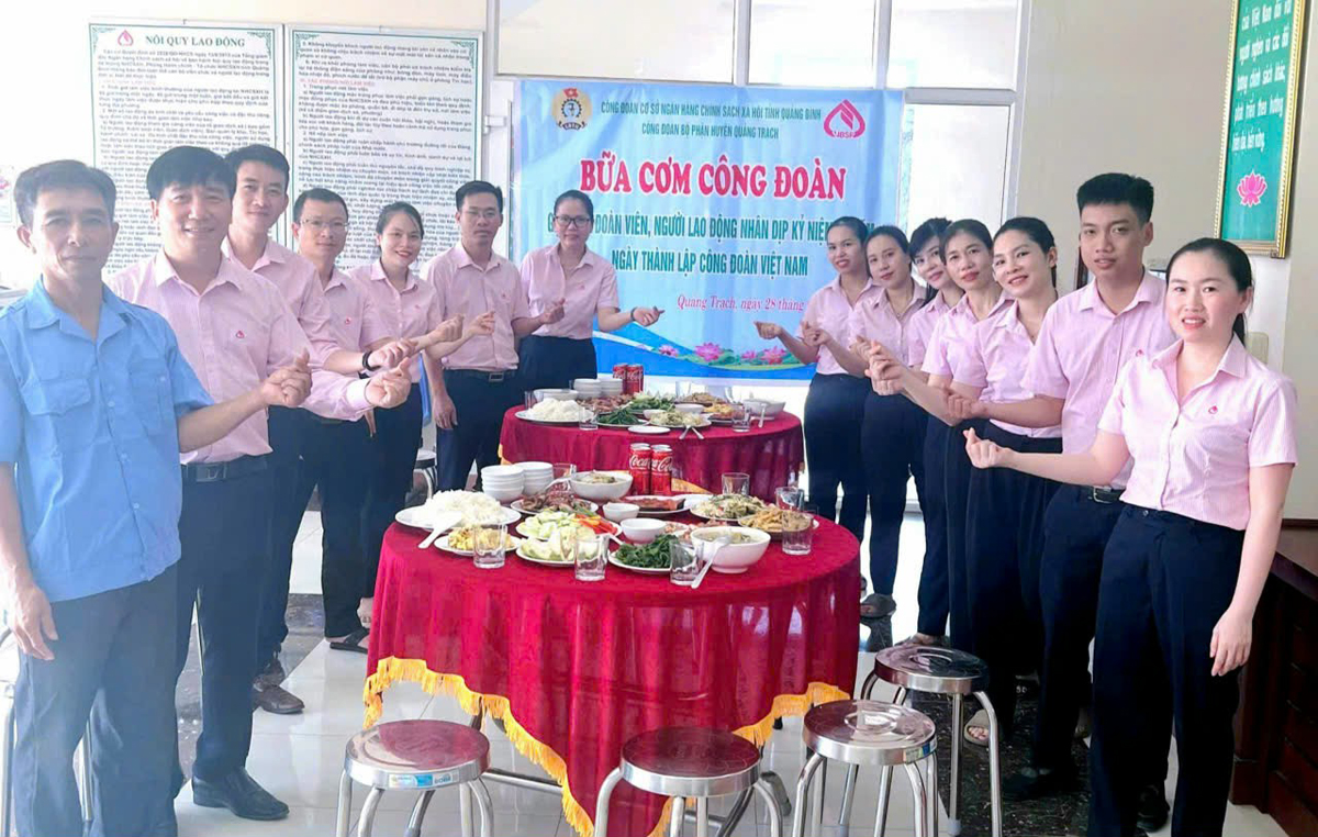 (Quang Binh Portal) - Nằm trong chuỗi hoạt động “Tháng Công nhân năm 2024” và các hoạt động chào mừng kỷ niệm 95 năm Ngày thành lập Công đoàn Việt Nam (28/7/1929 - 28/7/2024), trưa 28/8/2024, Công đoàn bộ phận Phòng Giao dịch Ngân hàng Chính sách xã hội huyện Quảng Trạch đã tổ chức “Bữa cơm Công đoàn” cho toàn thể đoàn viên, người lao động trong toàn đơn vị.