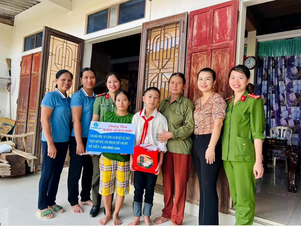Cùng với công tác chuyên môn, Hội Phụ nữ Công an cơ sở huyện Lệ Thủy còn quan tâm đến các hoạt động an ninh xã hội, công tác đền ơn đáp nghĩa, nhân đạo từ thiện, lan tỏa tinh thần tương thân tương ái, nghĩa cử cao đẹp của người chiến sỹ Công an nhân dân. Thực hiện kế hoạch của Hội Phụ nữ Bộ Công an, Hội LHPN về chương trình “Mẹ đỡ đầu” đã nhận hỗ trợ chăm sóc 02 trẻ em, có hoàn cảnh gia đình đặc biệt, khó khăn biết vươn lên trong cuộc sống; Hội đã liên kết với Đoàn Thanh niên Công an huyện đã trao tặng 72 suất quà trị giá 25 triệu đồng; Ngoài ra, những hy sinh thầm lặng của nữ chiến sỹ không kể ngày nghỉ thứ 7, Chủ nhật, ngày Lễ, Tết các hội viên nữ luôn nêu cao tinh thần trách nhiệm, tận tâm để cấp Căn cước công dân, cài đặt định danh điện tử cho người dân; thường trực quân số đảm bảo các yêu cầu nhiệm vụ tại đơn vị góp phần đảm bảo an ninh trật tự trên địa bàn. Ngoài ra, vào các dịp kỷ niệm, Hội phụ nữ Công an huyện Lệ Thủy đã tổ chức chương trình về nguồn, thăm các địa chỉ đỏ trên địa bàn huyện; phát động tham gia hưởng ứng Tuần lễ Áo dài; không chỉ tham gia nhiều hoạt động chung sức vì cộng đồng và hướng về cơ sở mà Ban Chấp hành Hội còn quan tâm đến đời sống của từng hội viên, động viên nhau nỗ lực phấn đấu vươn lên hoàn thành tốt nhiệm vụ, thực hiện tốt thiên chức người vợ, người mẹ, người con trong gia đình.