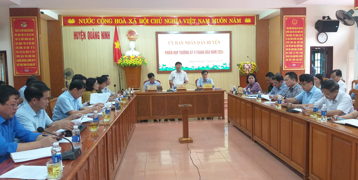 (Quang Binh Portal) - Chiều ngày 03/10/2024, huyện Quảng Ninh tổ chức hội nghị UBND huyện mở rộng nhằm đánh giá kết quả thực hiện nhiệm vụ phát triển kinh tế - xã hội 9 tháng, triển khai nhiệm vụ trọng tâm 3 tháng cuối năm 2024. Đồng chí Nguyễn Ngọc Thụ, Phó Bí thư Huyện ủy, Chủ tịch UBND huyện; đồng chí Lê Ngọc Huân, Phó Chủ tịch Thường trực UBND huyện và đồng chí Trần Xuân Tình, Phó Chủ tịch UBND huyện chủ trì hội nghị. Hội nghị được tổ chức theo hình thức trực tiếp tại hội trường UBND huyện và trực tuyến tại các điểm cầu 15 xã, thị trấn.