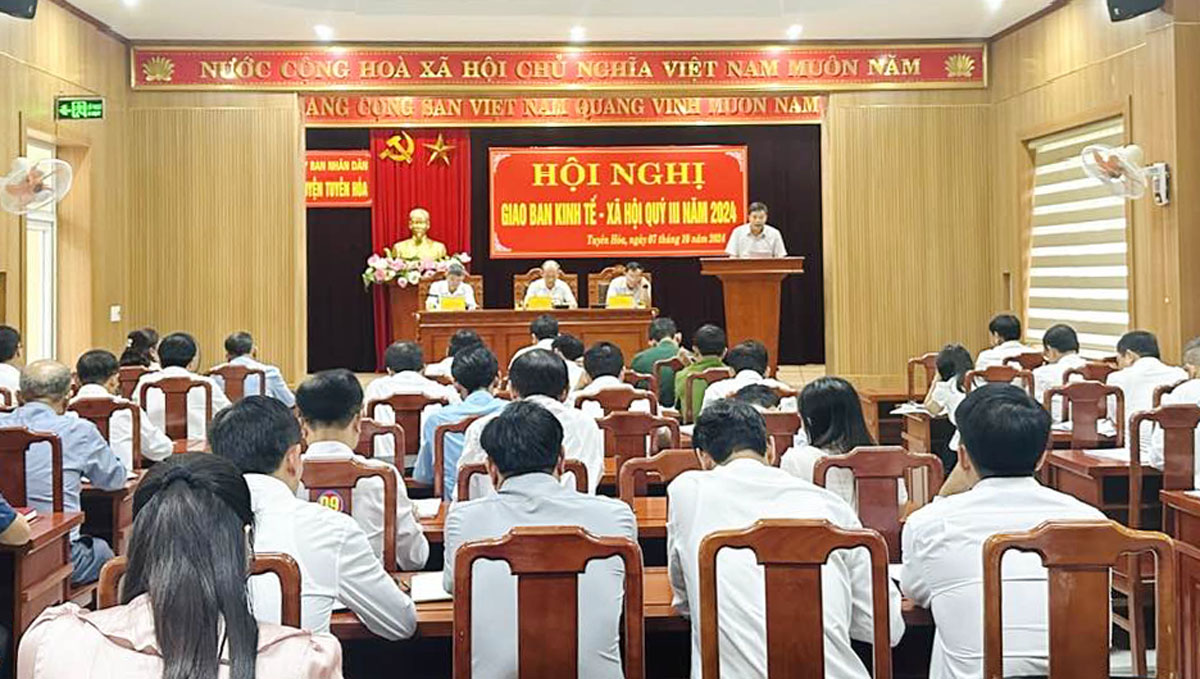 (Quang Binh Portal) - Sáng ngày 07/10/2024, UBND huyện Tuyên Hóa tổ chức hội nghị giao ban kinh tế - xã hội quý III và 9 tháng năm 2024, triển khai nhiệm vụ những tháng còn lại của năm 2024. Các đồng chí lãnh đạo UBND huyện Tuyên Hóa chủ trì hội nghị.