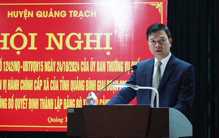 (Quang Binh Portal) - Sáng ngày 25/11/2024, huyện Quảng Trạch tổ chức hội nghị công bố Nghị quyết số 1242/NQ-UBTVQH15, ngày 24/10/2024 của Ủy ban Thường vụ Quốc hội và triển khai kế hoạch thực hiện việc sắp xếp đơn vị hành chính cấp xã giai đoạn 2023 - 2025 trên địa bàn huyện. Tham dự có đồng chí Phạm Thị Hân, Ủy viên Ban Thường vụ Tỉnh ủy, Chủ tịch Ủy ban MTTQVN tỉnh; đại diện lãnh đạo các sở, ban, ngành, địa phương liên quan.