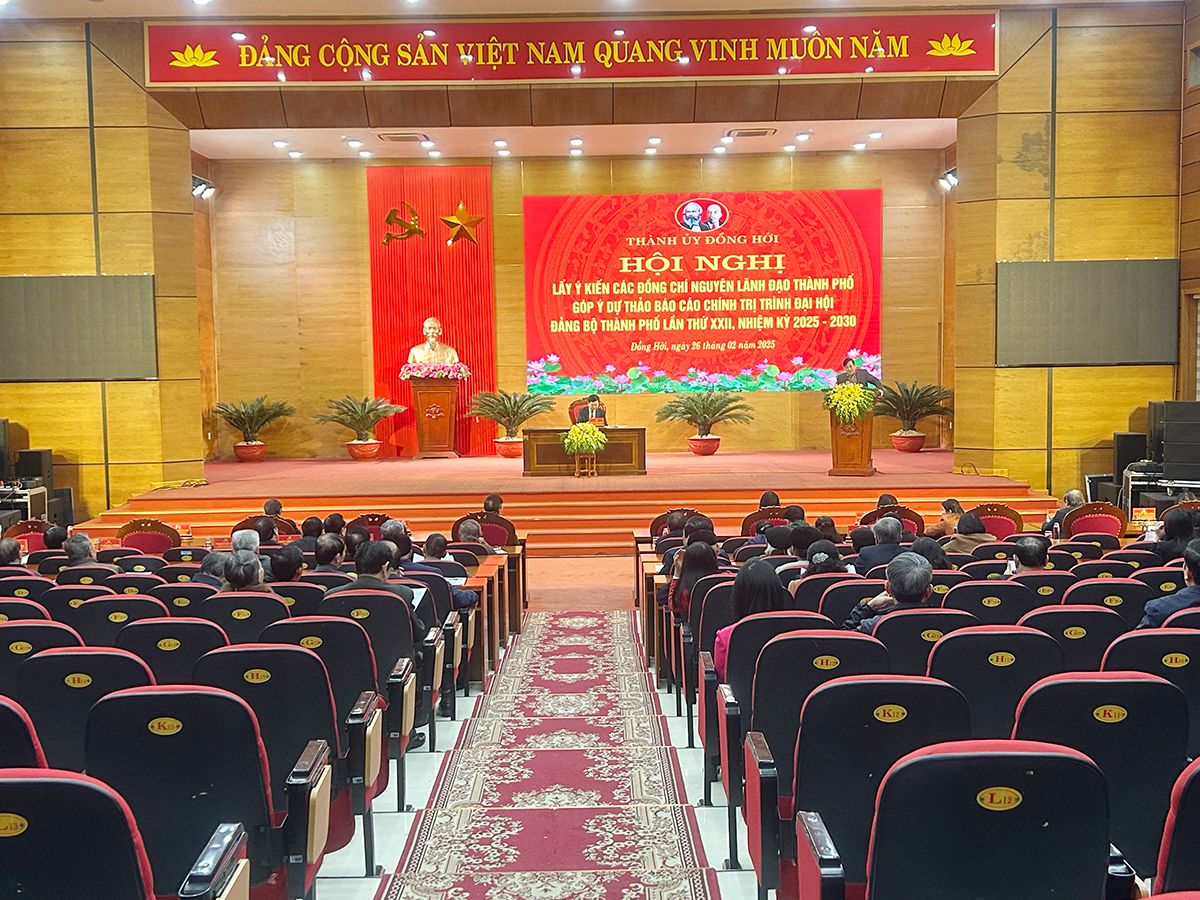 (Quang Binh Portal) - Ngày 26/02/2025, Thành ủy Đồng Hới tổ chức hội nghị lấy ý kiến của các đồng chí nguyên lãnh đạo thành phố góp ý vào dự thảo Báo cáo chính trị trình Đại hội Đại biểu thành phố Đồng Hới lần thứ XXII, nhiệm kỳ 2025 - 2030.