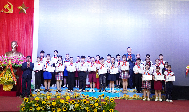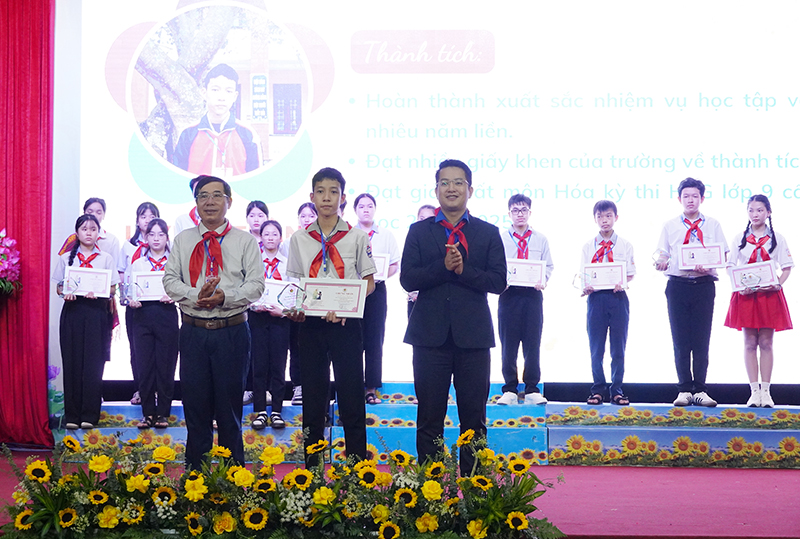 Lãnh đạo huyện Bố Trạch, Hội đồng Đội tỉnh trao tặng biểu trưng và giấy chứng nhận “Cháu ngoan Bác Hồ” cho các đội viên tiêu biểu